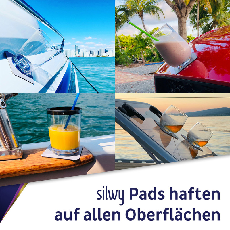 2 x Magnet-Sektgläser (High-Tech Kunststoff) sowie 2 x metallische Untersetzer. silwy Gel-Untersetzer sind rückstandslos entfernbar, abwaschbar und beliebig oft wiederverwendbar. Magnet-Trinkbecher bitte per Hand reinigen.